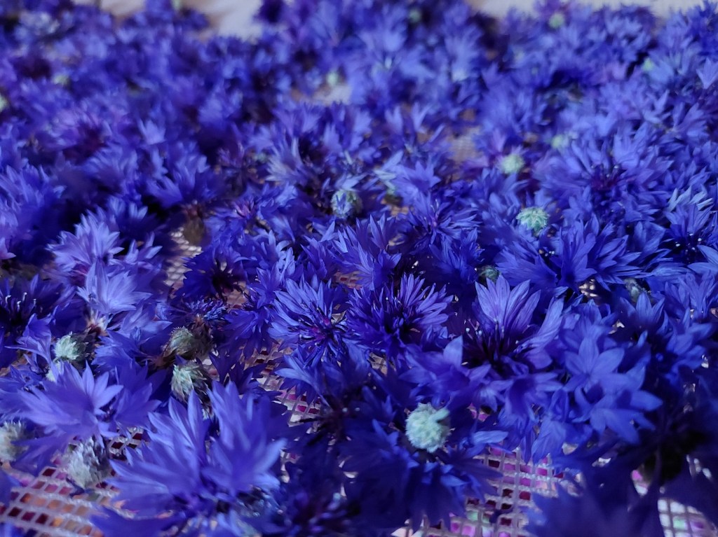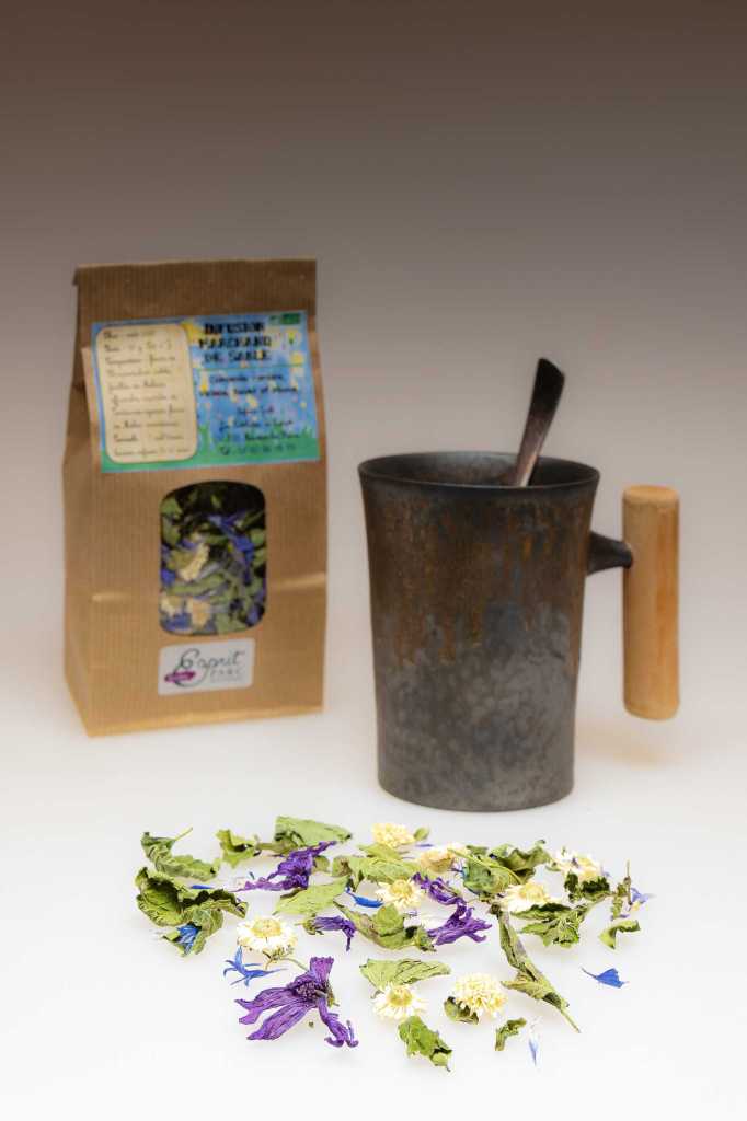 Marchand de sable : feuilles de mélisse (Melissa officinalis)*, fleurs de camomille (Chamaemulum nobile)*, capitules de bleuet (Centaurea cyanus)*, fleurs de mauve (Malva Mauritania)*