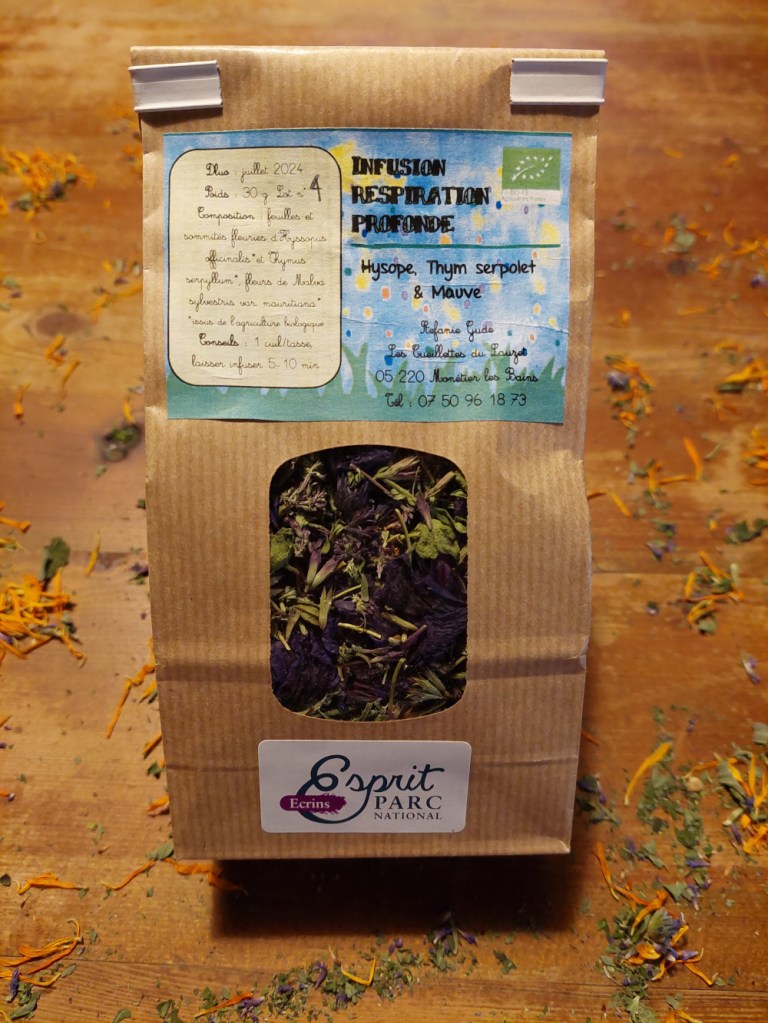 Respiration profonde : feuilles et sommités fleuries d’hysope (Hyssopus officinalis) * et thym serpolet (Thymus serpyllum)*, fleurs de mauve (Malva sylvestris var. mauritiana)*